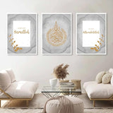 This multi-panel wall art features the elegant script of "Bismillah-ir-Rahman-ir-Raheem" in modern Arabic calligraphy. Set against a soft background with leafy teal & feather motifs, it brings tranquility, faith, and elegance to any room. πΏποΈ
